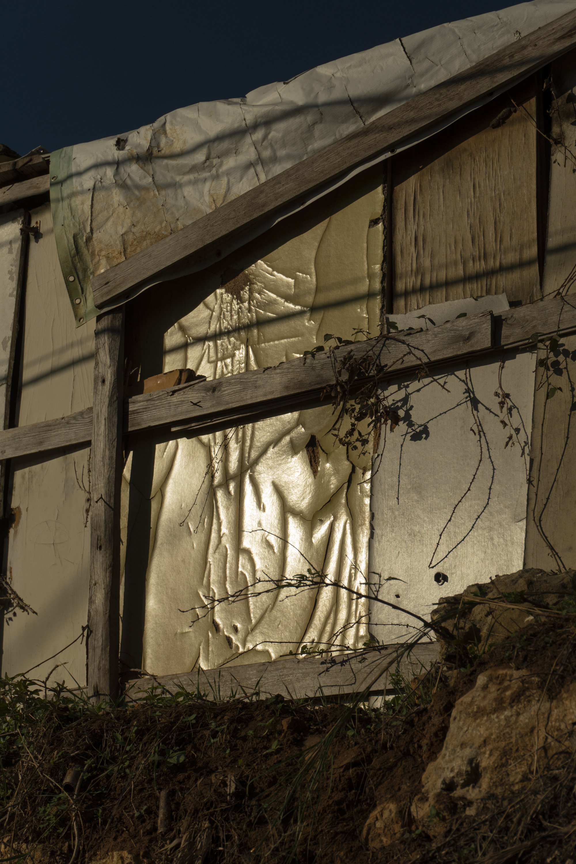 Bairro do Talude is a self-made neighboorhood, where individual and families originating from Cabo Verde land themselves into, or find shelter when faced with precarious circumstances. Often unsee or misrepresented, this former military zone becomes a space of both refuge and slow resistance. Thrown away material is collaged with new, creating living and working spaces. A space between blurriness and rawness, seemingly hidden but always transforming.